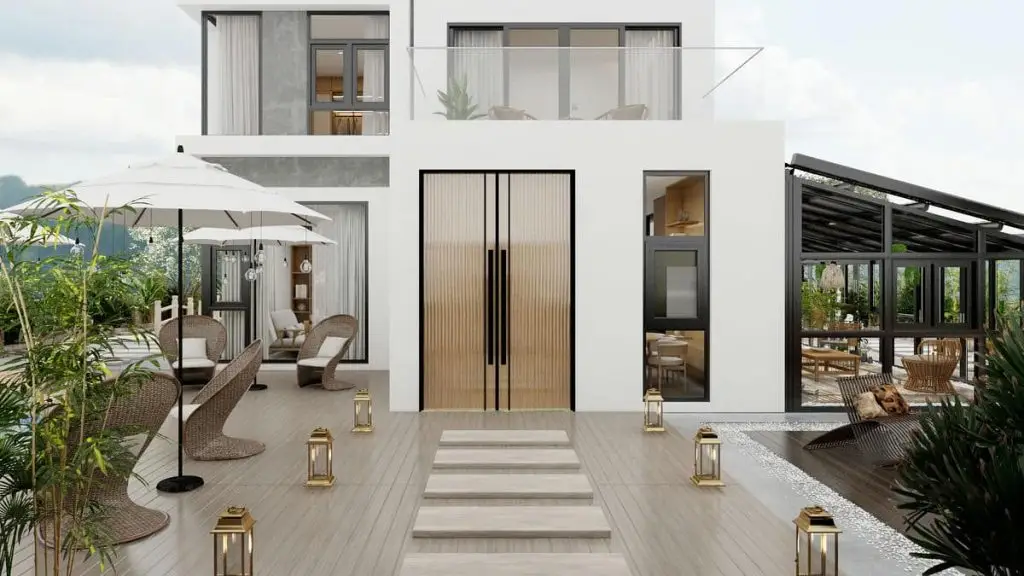 Thiết kế độc đáo: Villa House Country mang đậm phong cách kiến trúc đương đại, tối giản nhưng không kém phần sang trọng. Các đường nét hình khối mạnh mẽ, kết hợp cùng những mảng kính lớn trong suốt, tạo nên một không gian mở, kết nối con người với thiên nhiên.